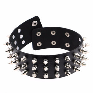 Vegan Leather 2-Row Short Black Spike Buckle Wristband Cuff