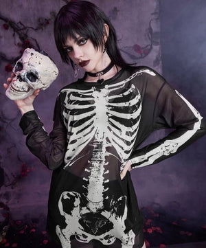 Black Mesh Longsleeve Skeleton Print Short Dress