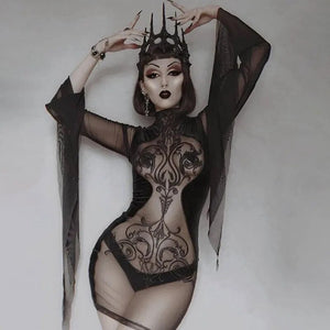 Black Velvet & Embroidered Mesh Mini Dress w/ Bell Sleeves