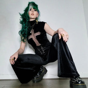 Black Velvet & Mesh Cross Cutout Crop Top Shirt